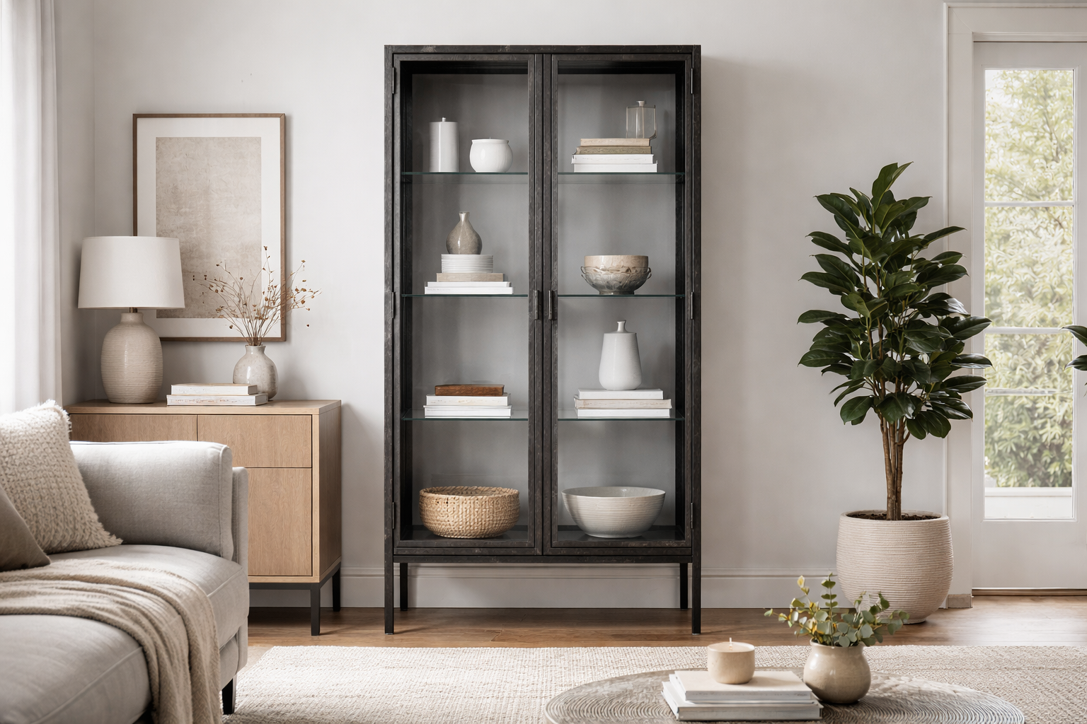 Vitrina metal y vidrio - 75x38x155 cm - negra - para salón diseño industrial con puertas de vidrio