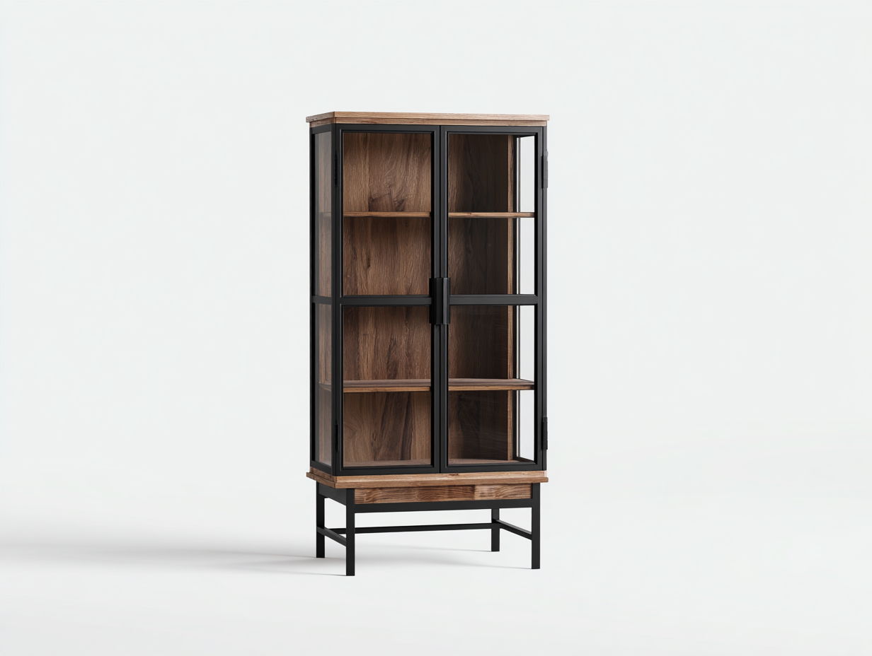 Esta vitrina de estilo industrial combina una estructura robusta con un diseño elegante que permite exhibir objetos decorativos, vajilla o libros en el salón, comedor o despacho. Las puertas de vidrio permiten visualizar el interior con claridad mientras mantienen los artículos protegidos del polvo.